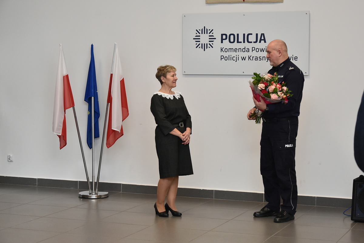 Z okazji przejścia na emeryturę Komendant Powiatowy Policji w Krasnymstawie podinspektor Szymon Mroczek złożył Pani Teresie serdeczne podziękowania za wieloletnią pracę oraz wkład w funkcjonowanie krasnostawskiej komendy. Nie zabrakło słów uznania, gratulacji oraz życzeń zdrowia, pomyślności i realizacji planów, na które wcześniej brakowało czasu.